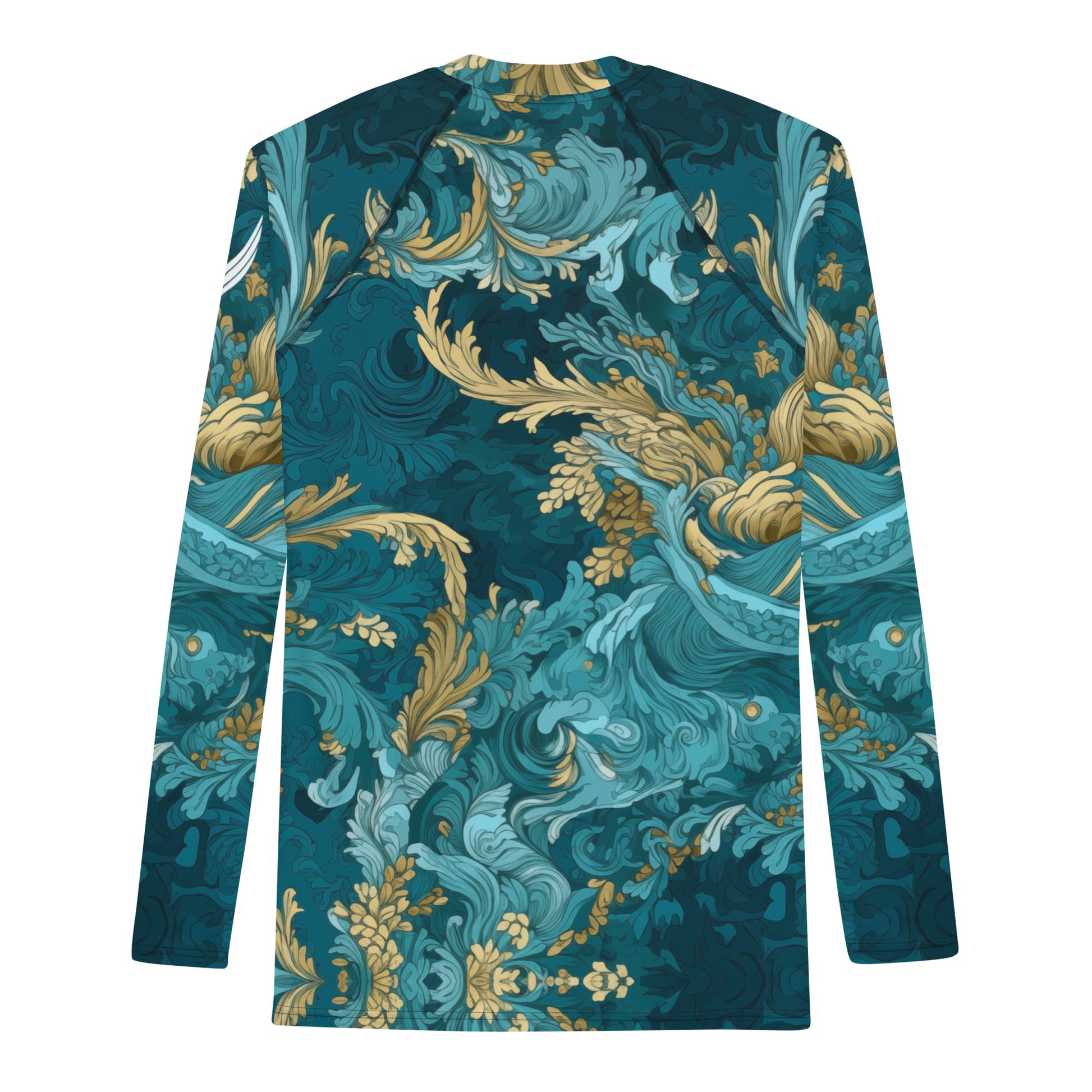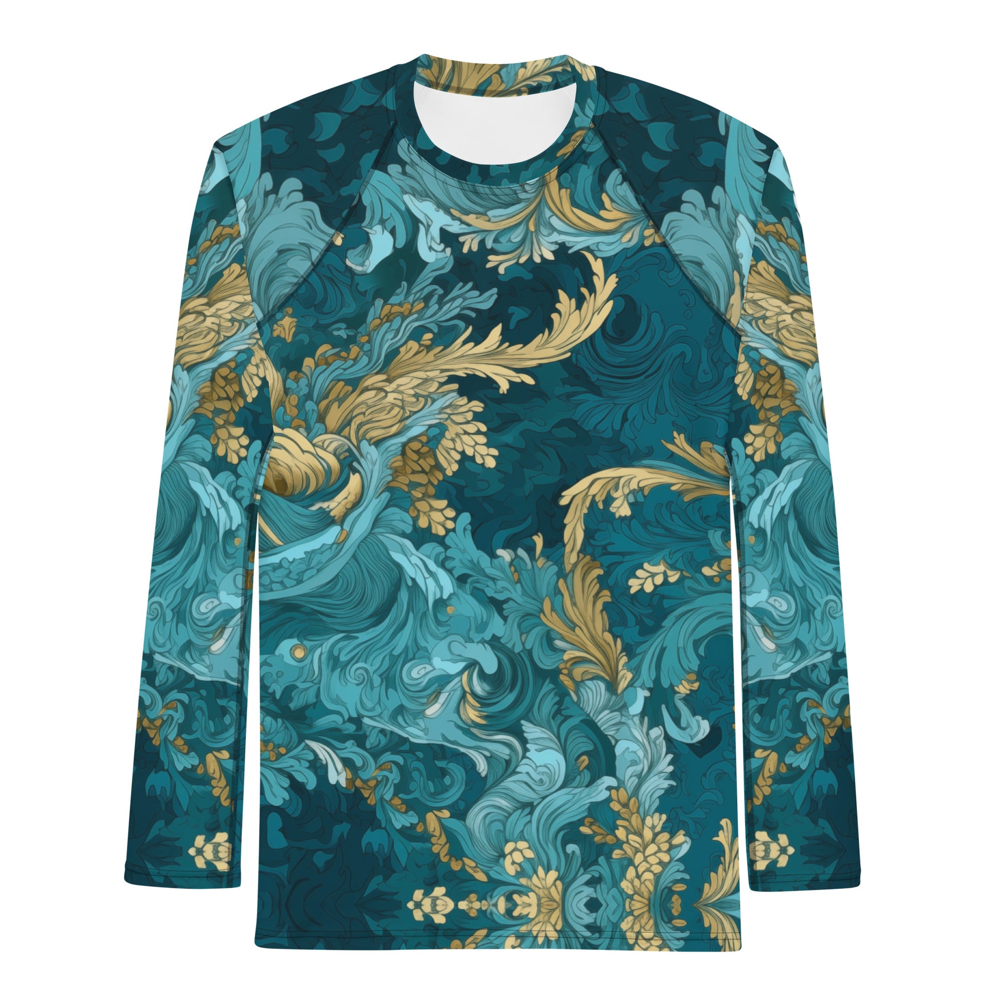 Embark on a voyage with the "Ocean Whisper" Rash Guard, a masterpiece that seamlessly translates the serenity and boundless depth of the ocean onto a wearable canvas. This exquisite piece captures the tranquil essence and profound mysteries of the sea through varying shades of blue, accented with touches of gold that symbolize the graceful winds guiding the ocean's majestic waves and currents. It's a homage to the unseen forces of nature, offering a statement of luxury, adventure, and a profound connection to the world's vast waters.