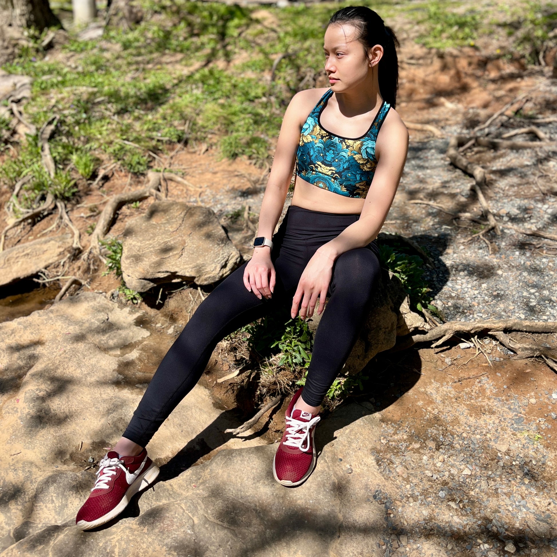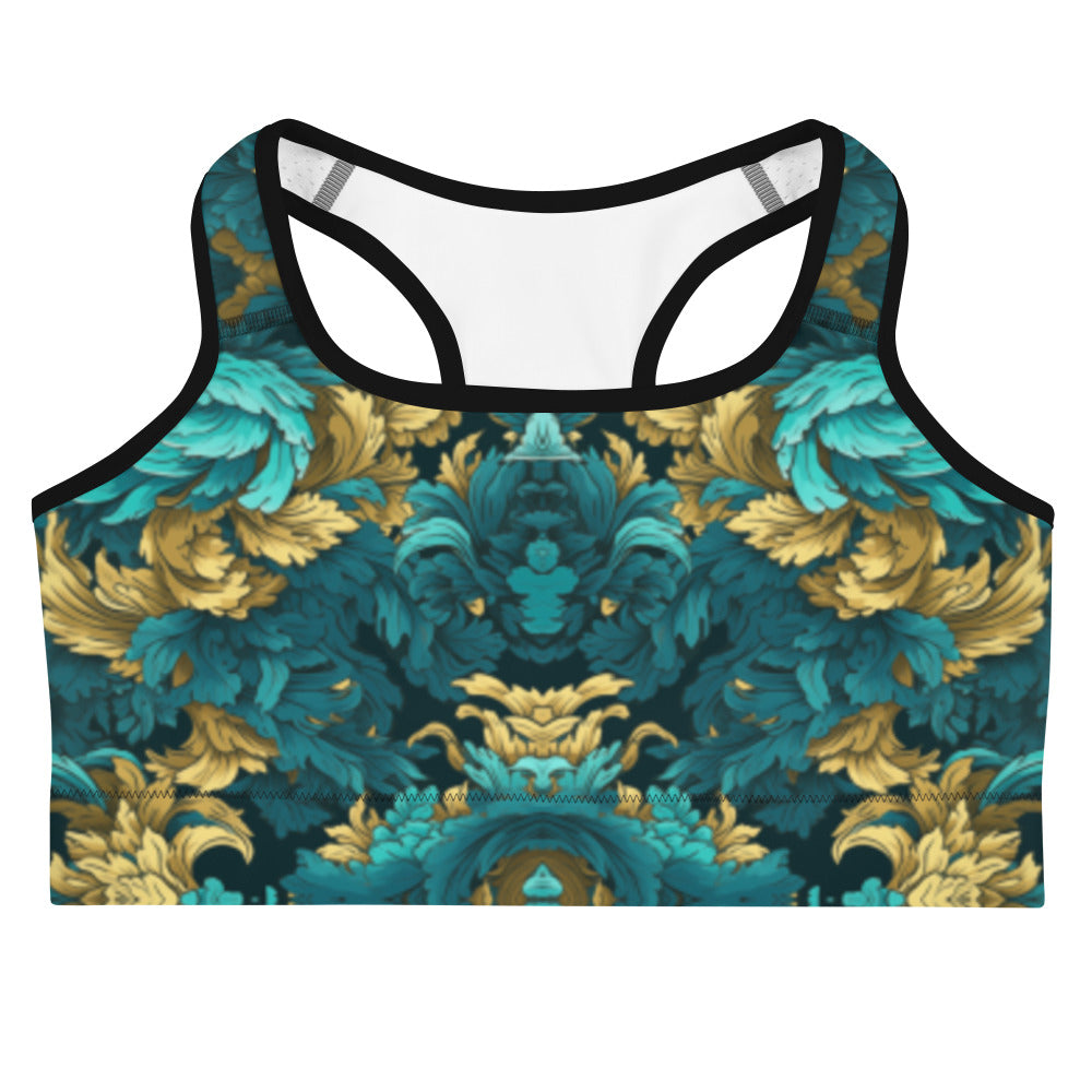 Discover the "Ocean Whisper" Sports Bra, where the serenity and depth of the ocean come alive in a design that embodies both elegance and functionality. This sports bra, inspired by the tranquil hues and gold accents of the ocean's waves and winds, is a perfect blend of style and performance.