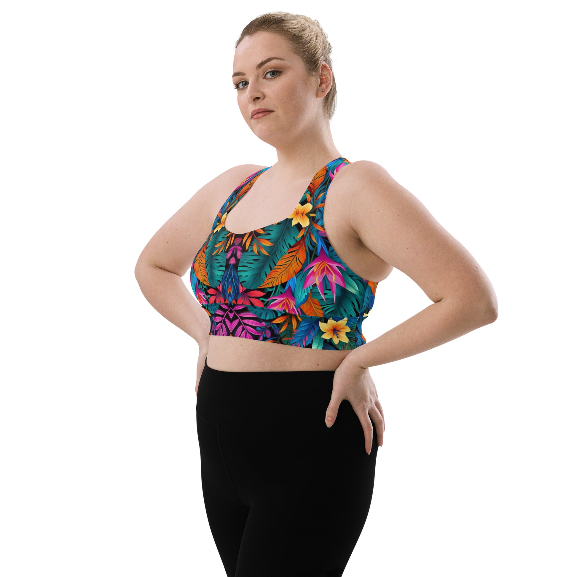 Our Terra Flora - Jardín del Éxtasis Longline Sports Bra offers functionality and a celebration of nature, feminine energy, and truth. It's a wearable reminder to honor the earth and your own divine essence. Reconnect with your power and elevate your workout wardrobe with this exceptional piece.